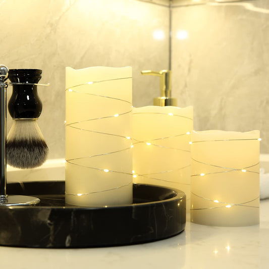 H-BLOSSOM Flickering Flameless Candles Ivory Real Wax Pillar with Embedded String Lights LED Candles Battery Operated with Cycling 5H Timer Set of 3 (3" x 4"/5"/6") (Ivory)