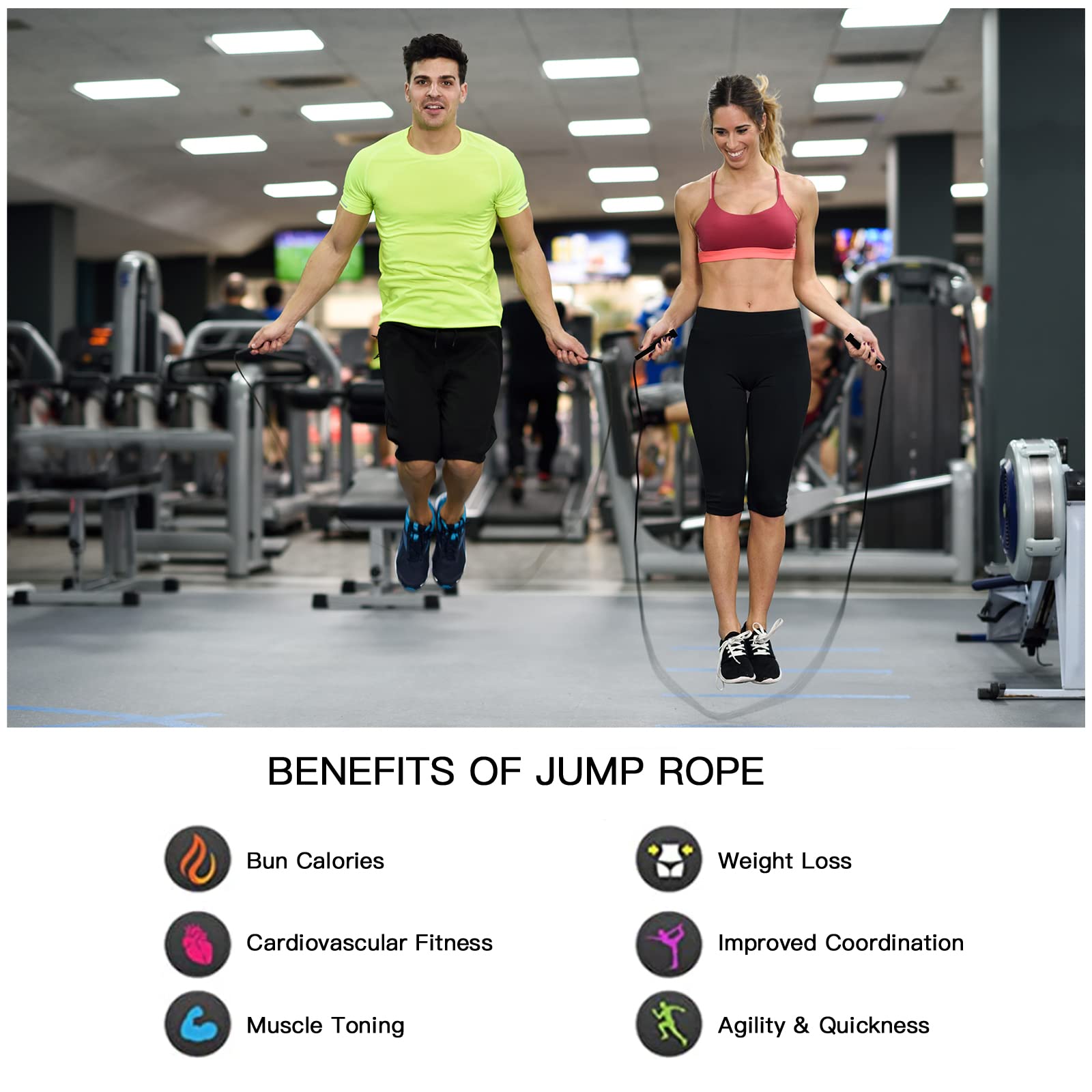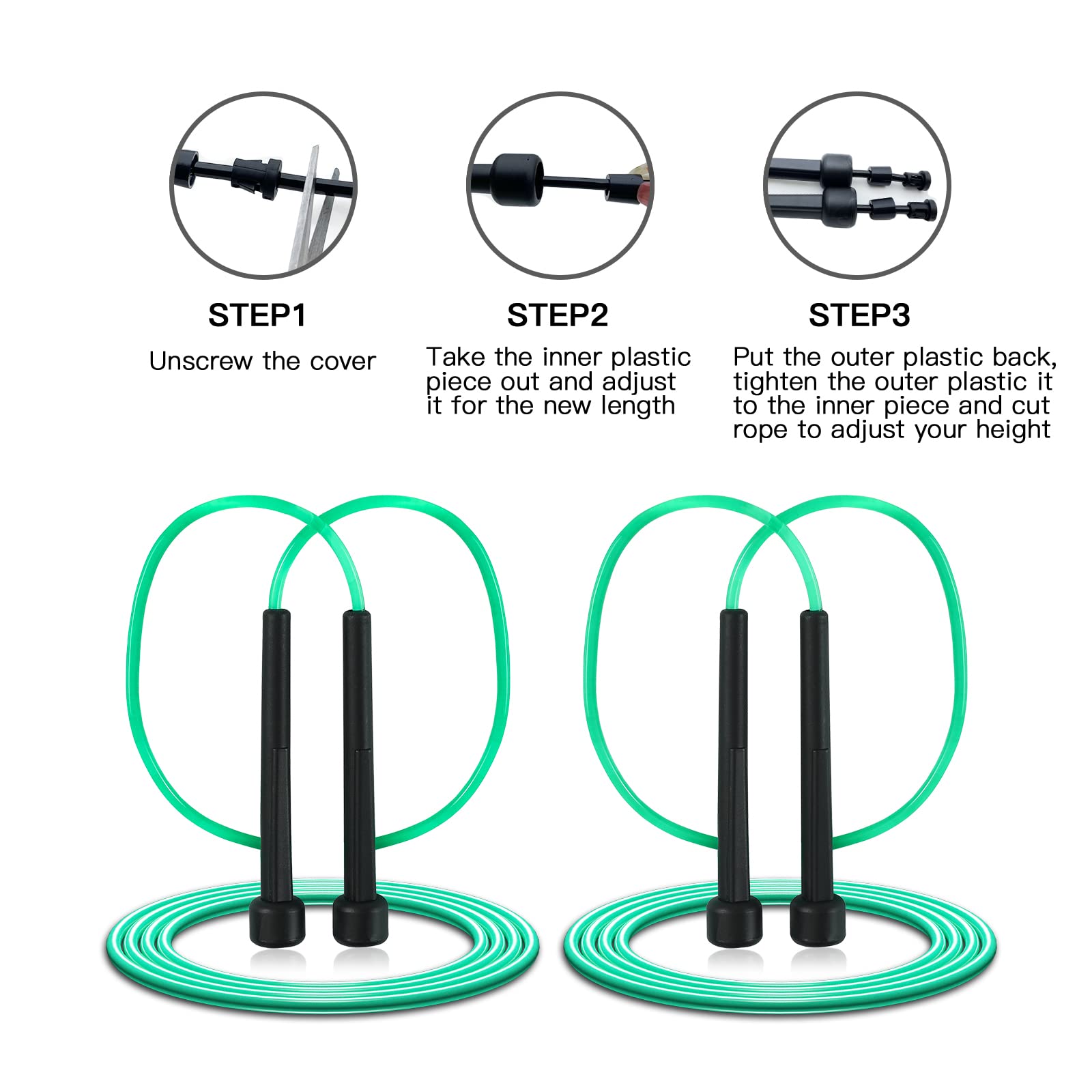 • [MATERIAL] The jumping rope is made of high quality PVC material, which is strong and durable and not easy to break. The handle is made of lightweight molded polypropylene plastic to ensure you have a firm grip every time you use it.