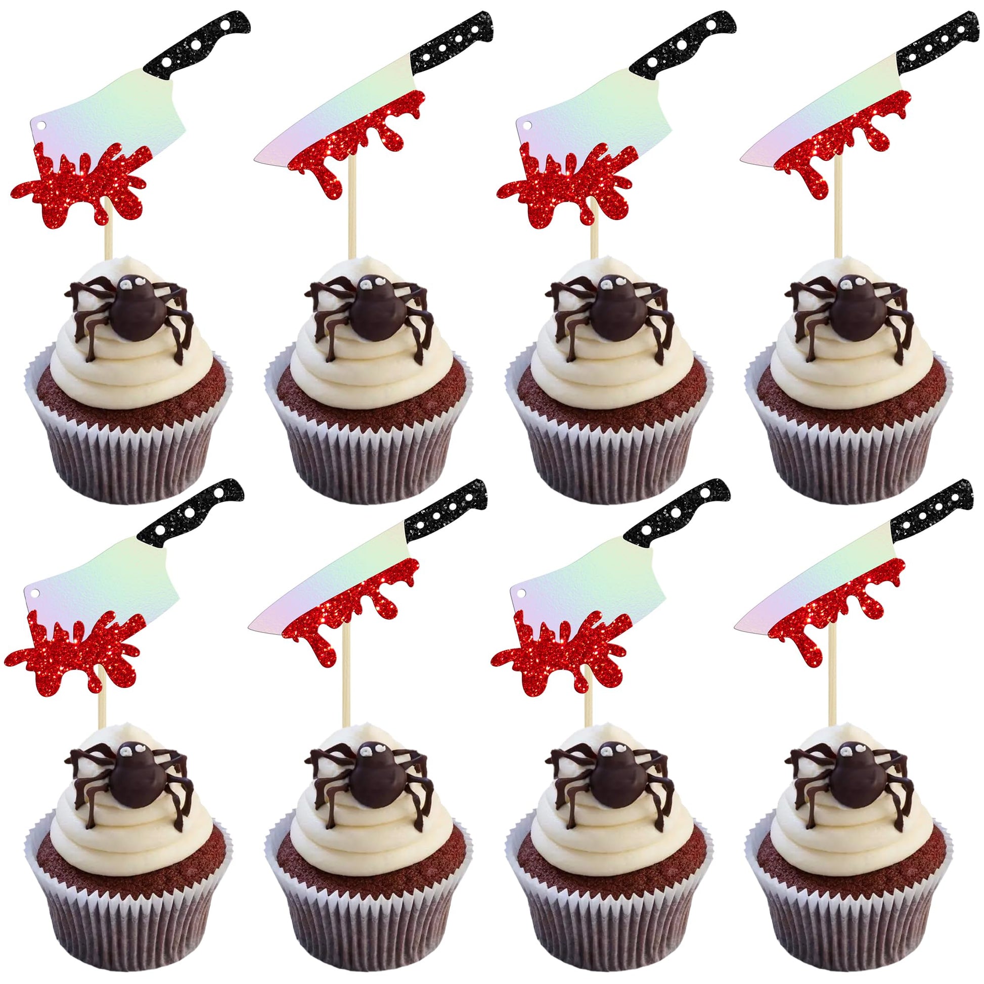 Gyufise 24Pcs Halloween Cupcake Toppers Glitter Horror Blood Knife Cupcake Picks Killer Birthday Cake Decorations for Halloween Blood Knife Theme Birthday Party Supplies