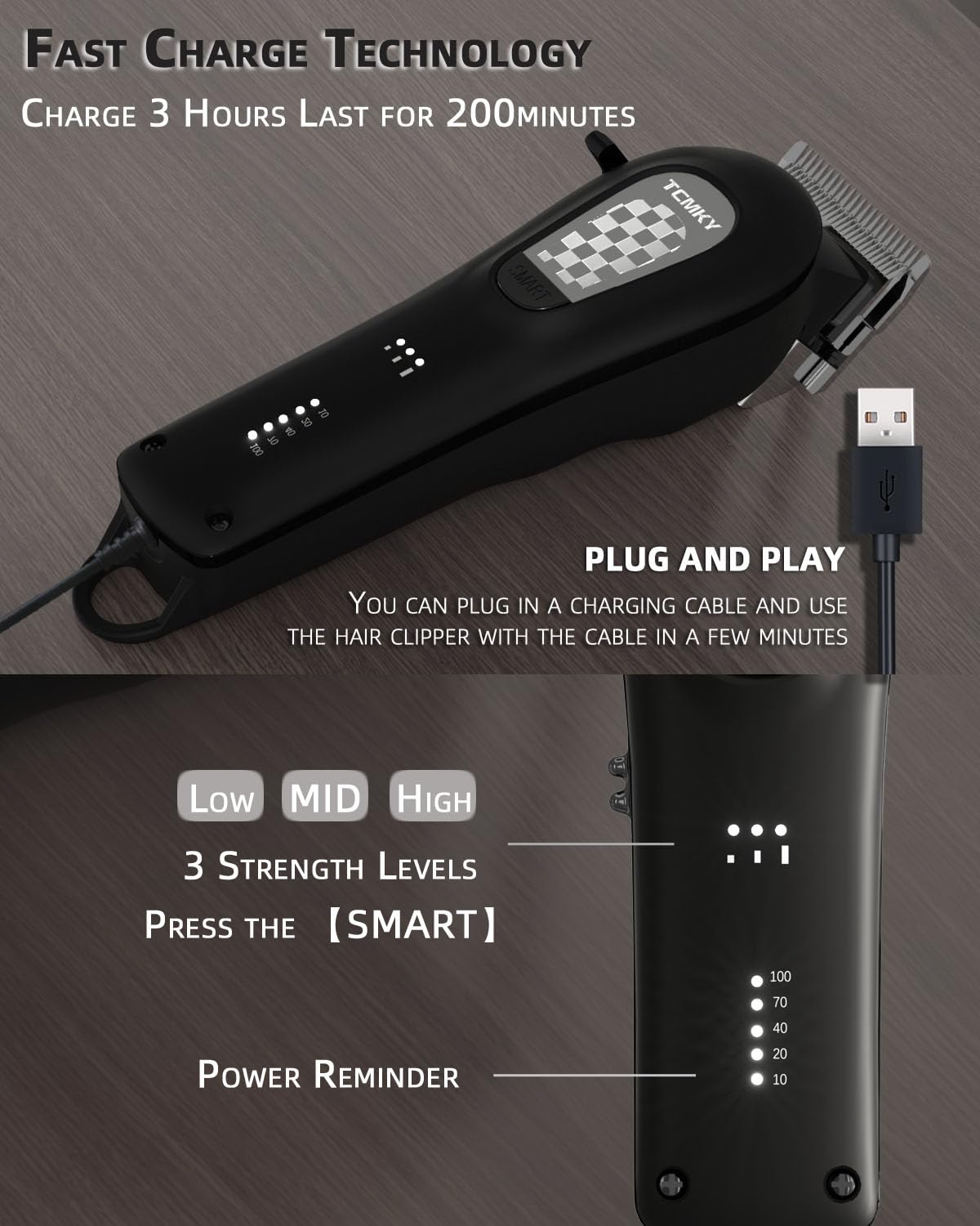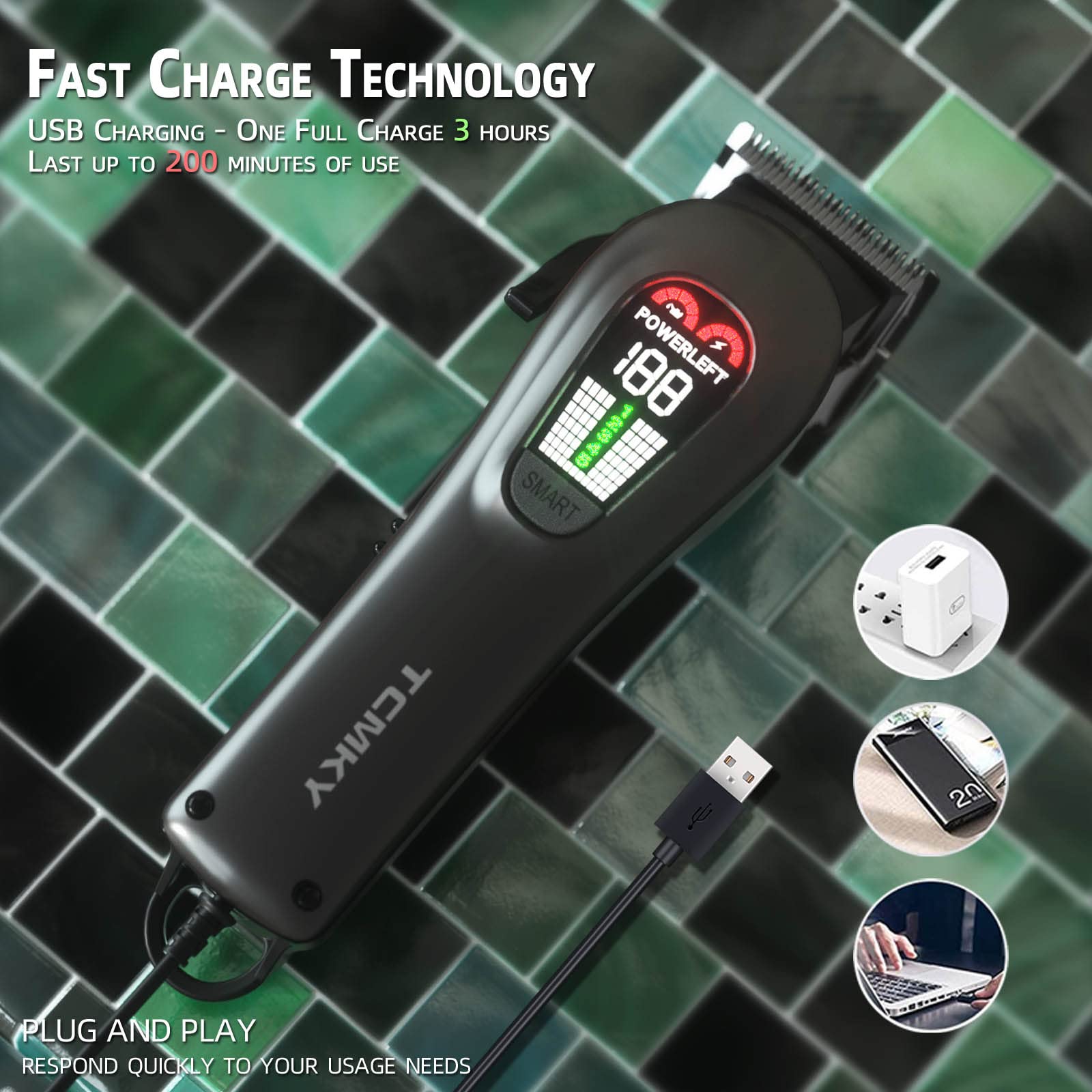 • CORDLESS&CORDED TCMKY Hair Clippers for men can be with cord or cordless which is super convenient for self cutting. USB charging 3Hours One full charge Last up to 200 minutes of use.When the power of the hair cutting kit is used up This hair clippers for men supports plug and play.When charging The charging capacity can be seen from the display.When the power in the display screen is 100% unplug the power cord