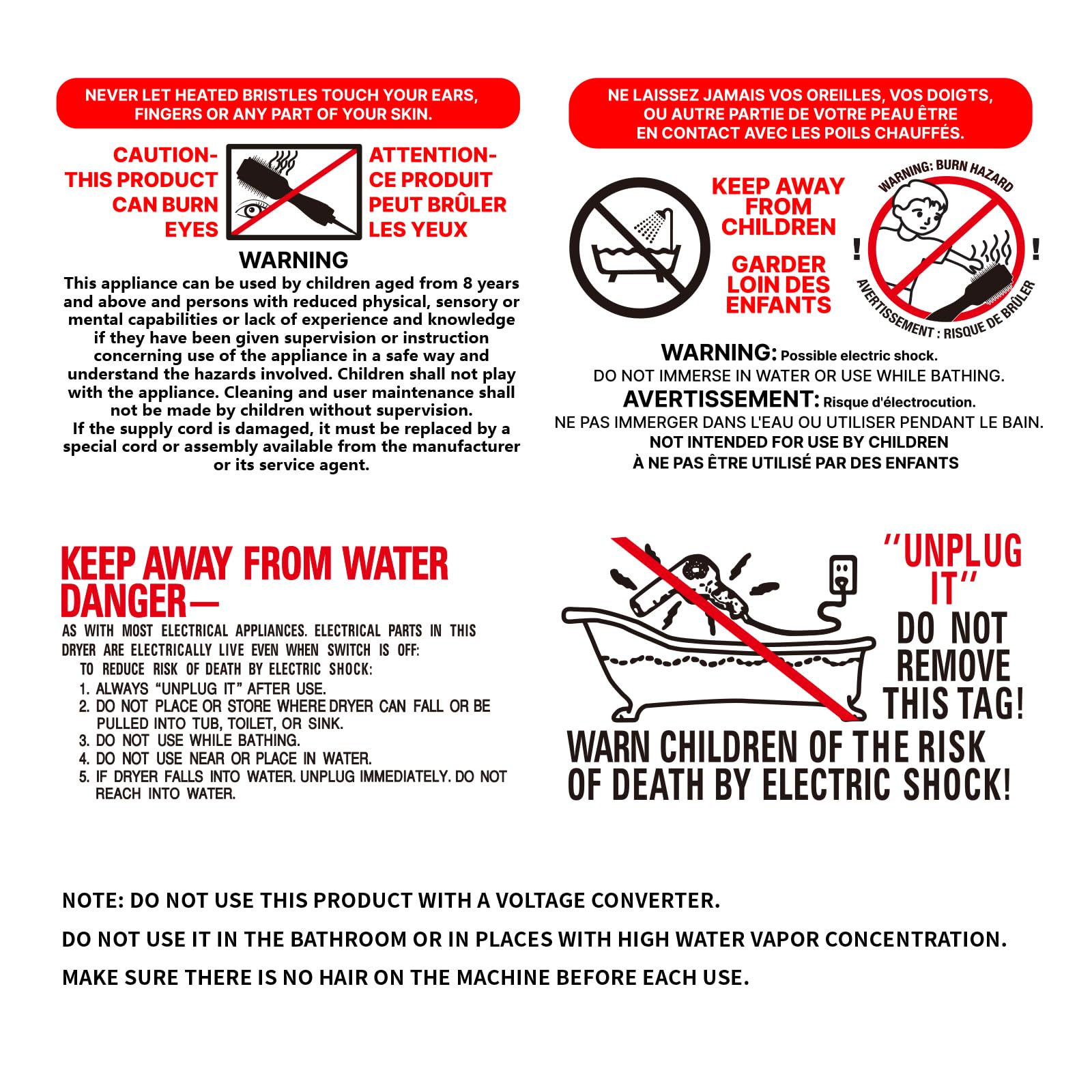 • Safe Use: Please read the user manual carefully before use. Our blowout brush comes with the ALCI plug, which meets U.S. safety requirements and features the ETL Certification. Note: Unit is designed for 110-120 Volt USA outlets only. DO NOT use a voltage converter or adapter as it will damage the unit. DO NOT use it in bathrooms or places with high moisture concentration. To extend the life of this hair dryer brush, use a cleaning brush after each use to remove the hair left on the machine