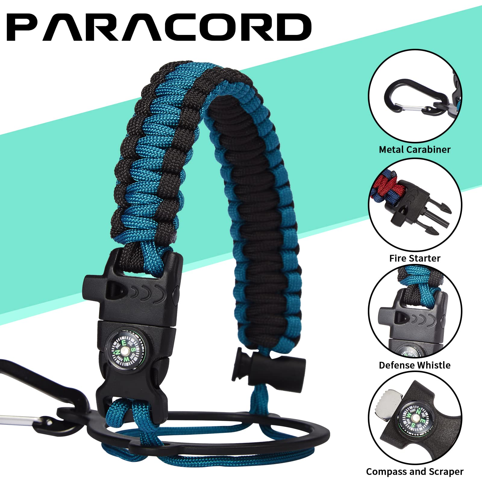 • UNIQUE DESIGNS PARACORD HANDLE: Full-function paracord handle made in individual styles to match the color of the flask water bottles. With compass, safety ring, carabiner, flint fire starter & whistle. It unravels into a sturdy and taut rope in an emergency, making the large water jug an ideal survival kit for expeditions in the wild