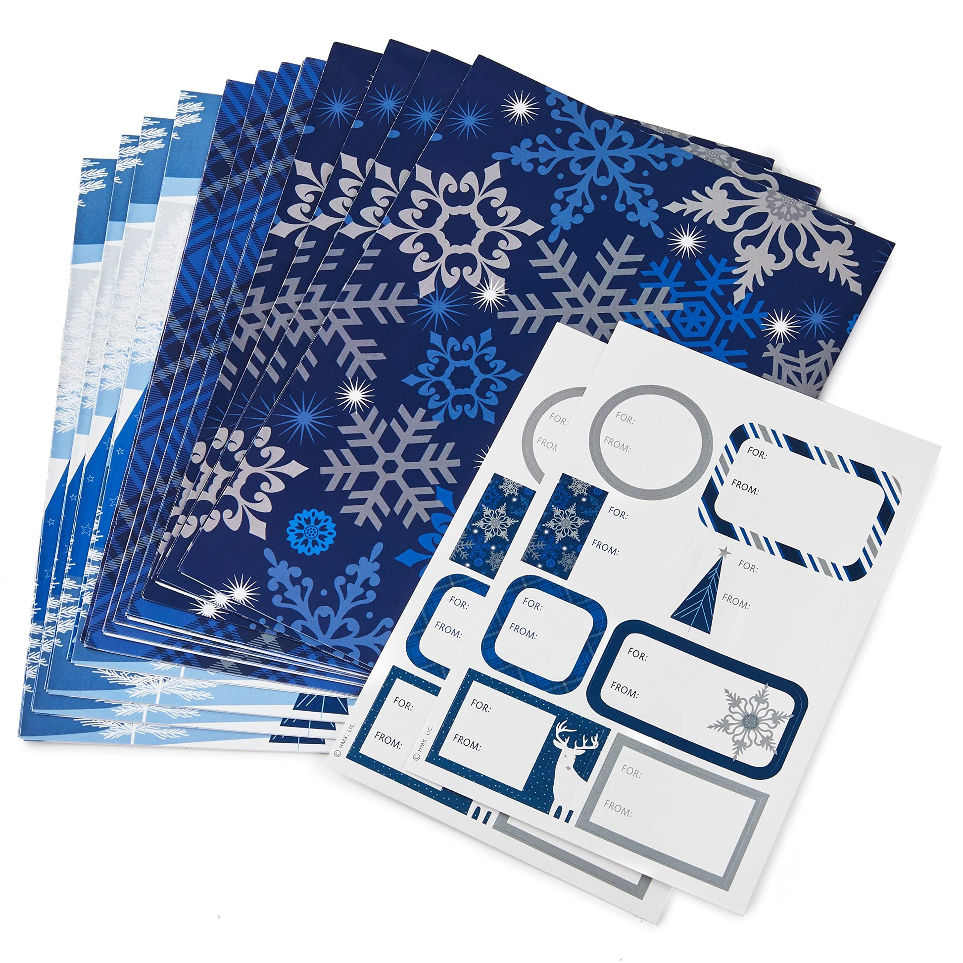 Details: Share more merry! Add joy to the holiday season with blue and silver flat wrapping paper sheets. Pack of 12 folded gift wrap sheets features 3 beautiful designs: blue tartan plaid, fancy snowflakes, and elegant snowy forest scene. Each sheet of wrapping paper measures 20' by 30', the perfect size to wrap a standard shirt box. Purchase includes 16 gift tag stickers to complete the look. Sheets are folded to 7.5' by 10' for easy storage. Great to have on hand for Hanukkah, Christmas, winter solstice, weddings, graduations, anniversaries, birthdays, or other elegant occasions. The Hallmark brand is widely recognized as the very best for greeting cards, gift wrap, and more. For more than 100 years, Hallmark has been helping its customers make everyday moments more beautiful and celebrations more joyful.