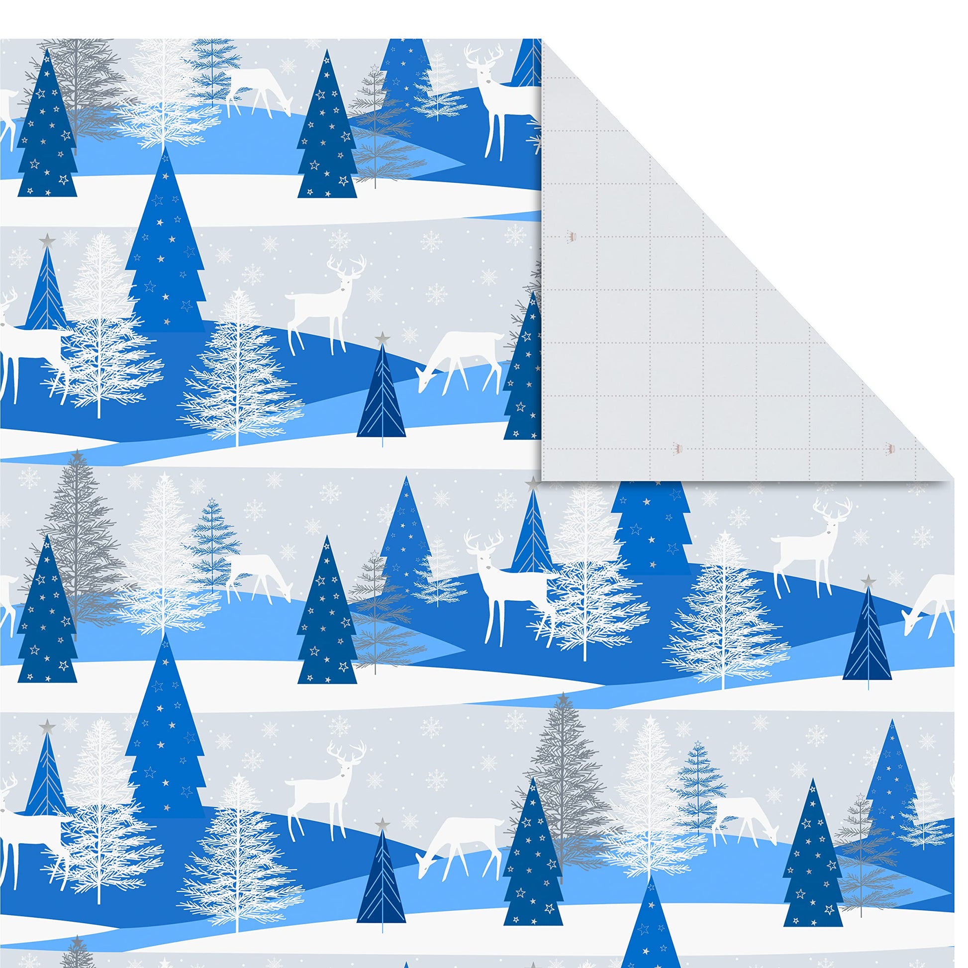 THREE ELEGANT DESIGNS: Blue and silver flat wrapping paper features 3 versatile designs: Blue and silver snowflakes, snowy forest scene with deer and trees, and blue tartan plaid; great for Christmas, Hanukkah, winter solstice, weddings and more