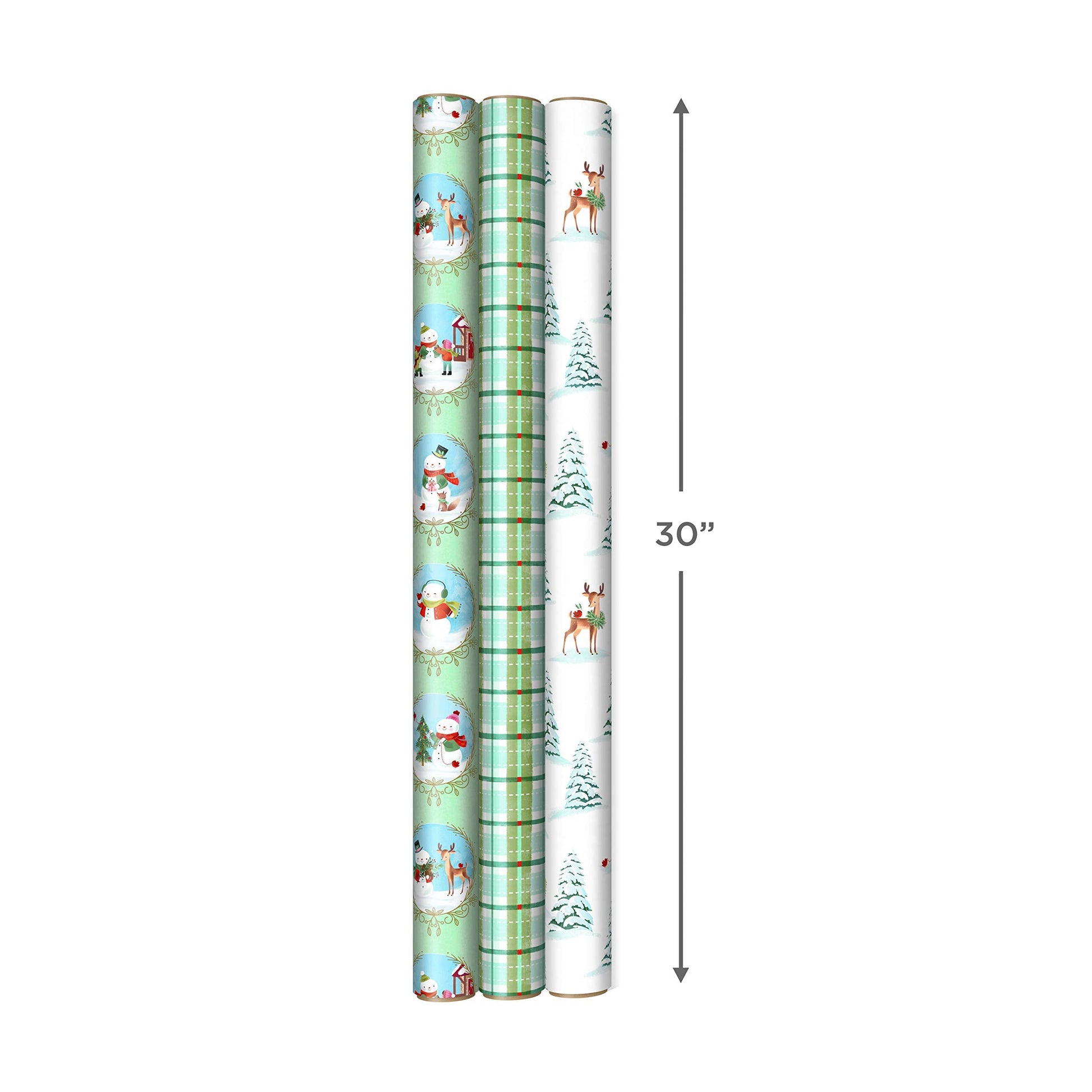 Hallmark Christmas Wrapping Paper Rolls, Holiday Gift Wrap (Pack of 3: 120 sq. ft. ttl) Storybook Critters, Snowmen, Green and Blue Plaid