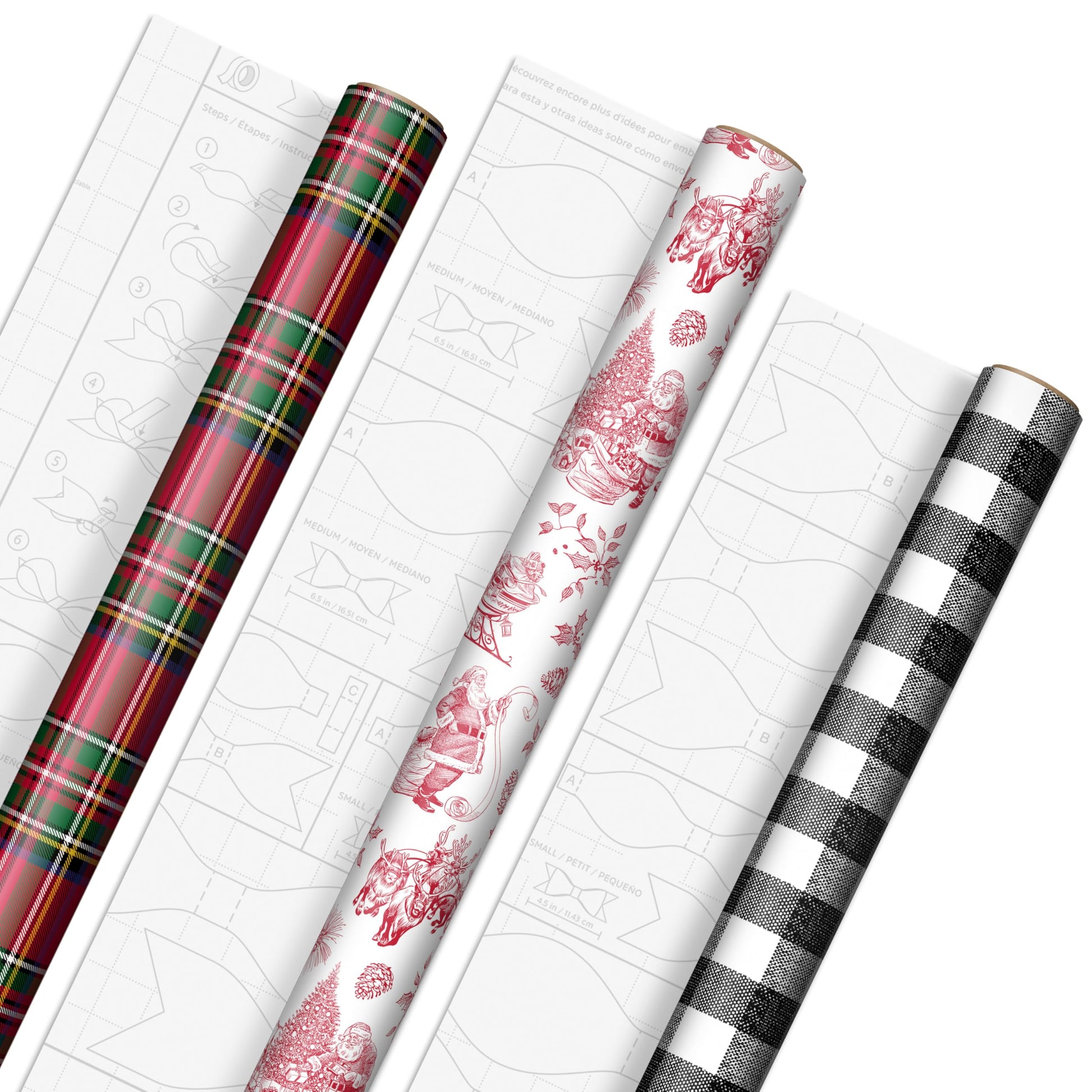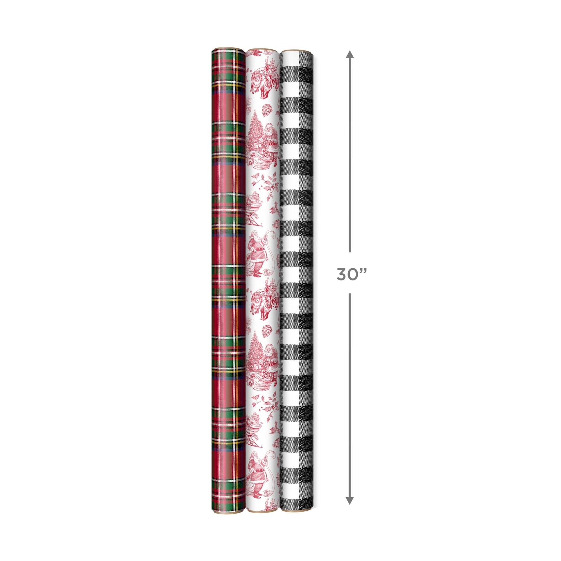 Hallmark Christmas Wrapping Paper Rolls, Holiday Plaid (3-Pack: 120 Sq. Ft. Ttl) Red Toile, Black Buffalo Check, Plaid for Christmas, Birthdays, Weddings, Crafts