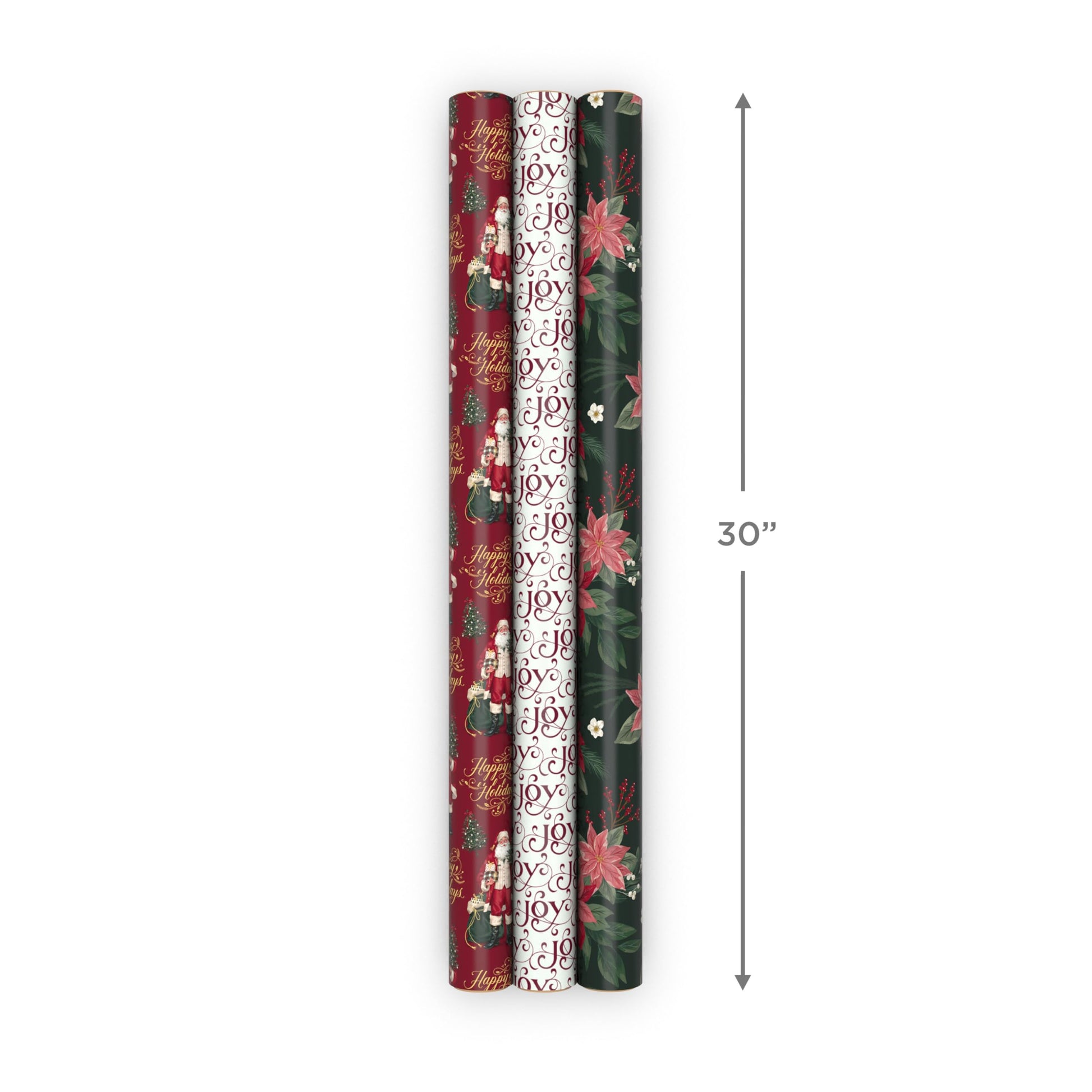Hallmark Elegant Christmas Wrapping Paper Rolls (3 Rolls: 120 Sq. Ft. Total) Red Joy on White, Santa Claus and Happy Holidays on Red, Painted Poinsettia on Hunter Green