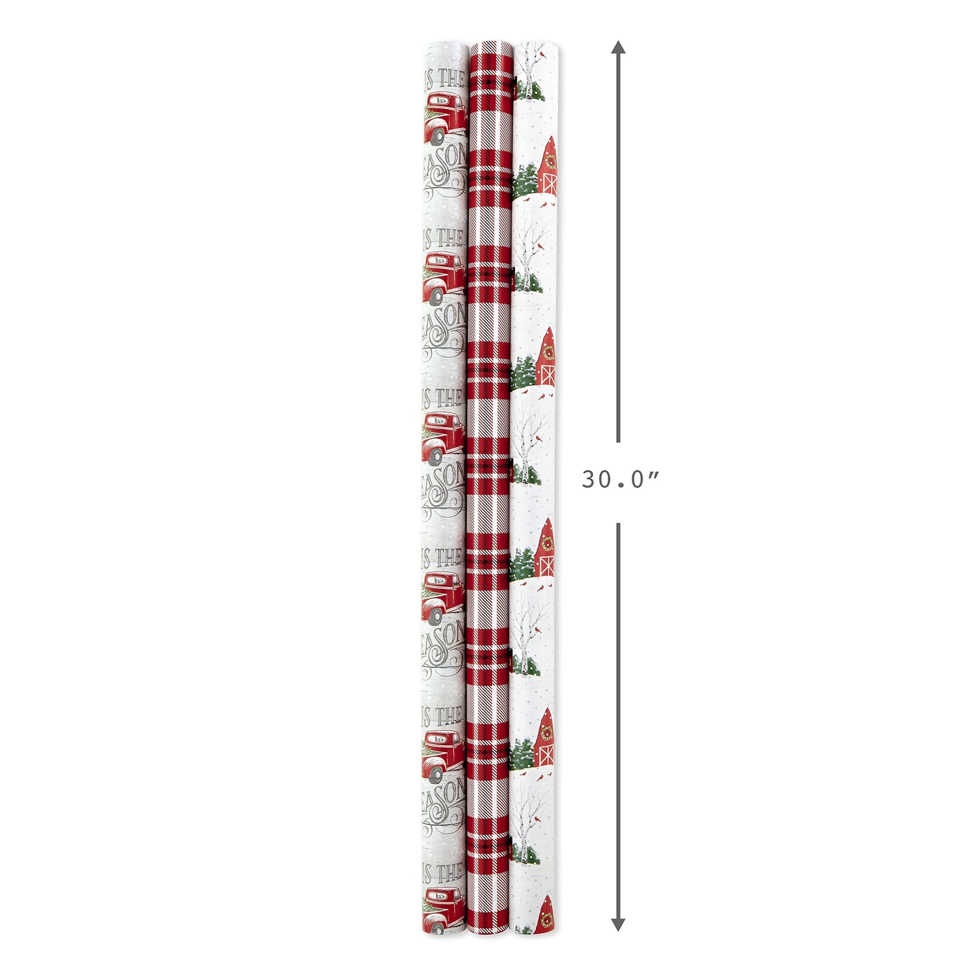 • Includes 3 rolls of reversible wrapping paper, each featuring 2 holiday designs: Snowy red barn on white / Black and white woodland landscape; Red and white plaid / Snowflakes and moose on silver; Vintage red truck with ''Tis the season' / White and silver horizontal stripes.