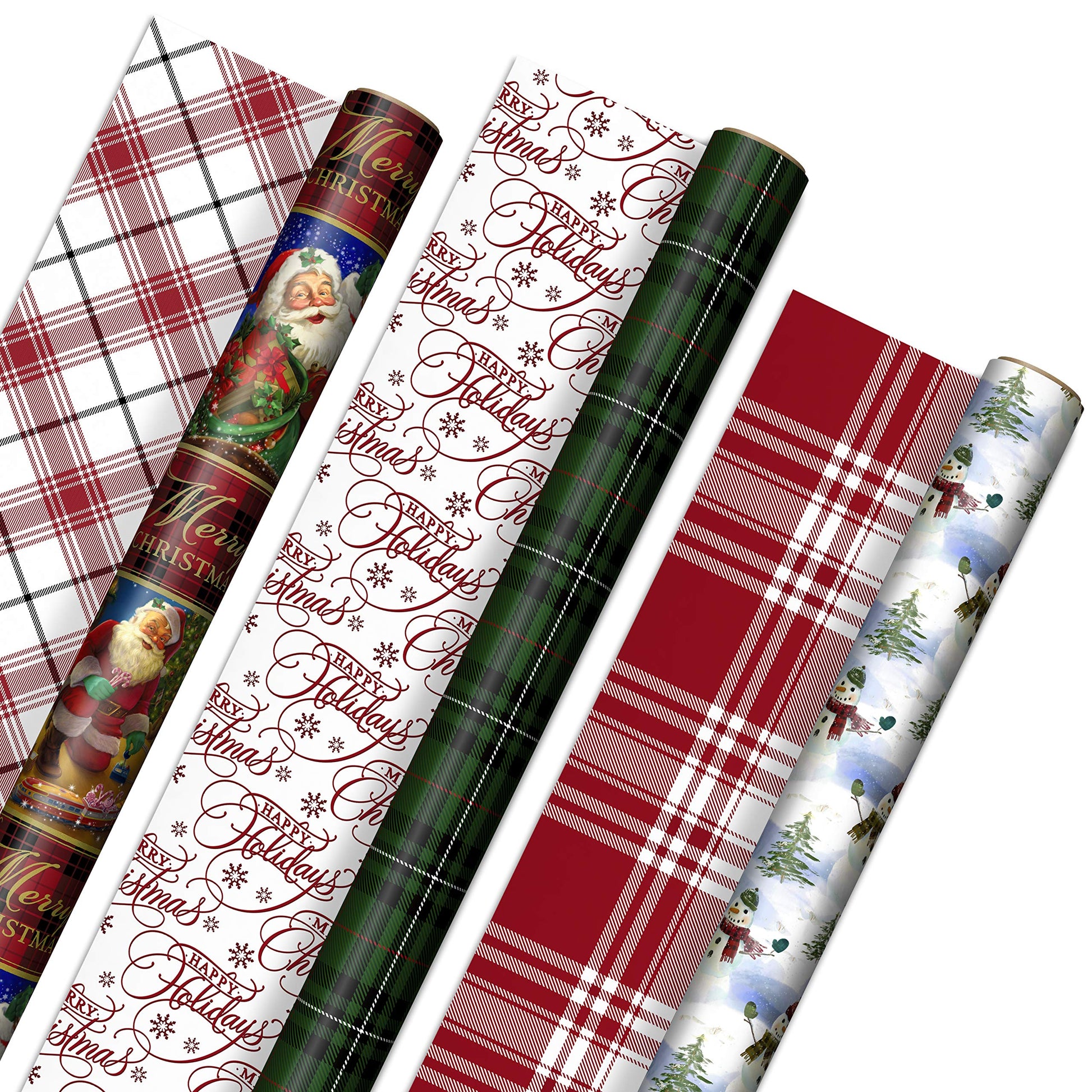 Hallmark Reversible Christmas Wrapping Paper (3 Rolls: 120 sq. ft. ttl) Vintage Santa, Snowmen, Traditional Green, Red and White Plaids