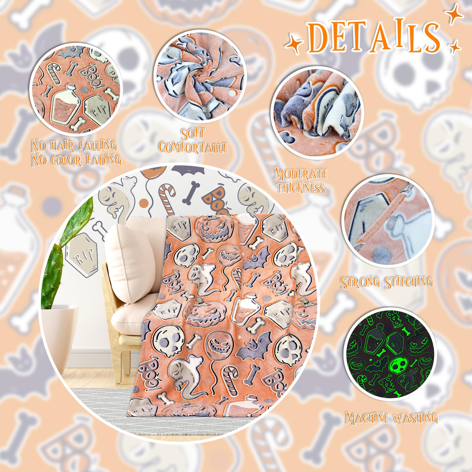 • HALLOWEEN DECORATIONS FOR HOME-our cute halloween blankets are not only soft halloween blankets but also halloween decor cute.such as skeleton halloween decor,halloween party decorations,halloween decorations outdoor,halloween room decor,halloween car accessories,cute spooky home decor,halloween pumpkin decorations,halloween living room decor,skull decor,spooky decor,hocus pocus decor,horror decor,ghost decor.amazing blanket to get into spooky season use as a spooky blanket to snuggle up with.