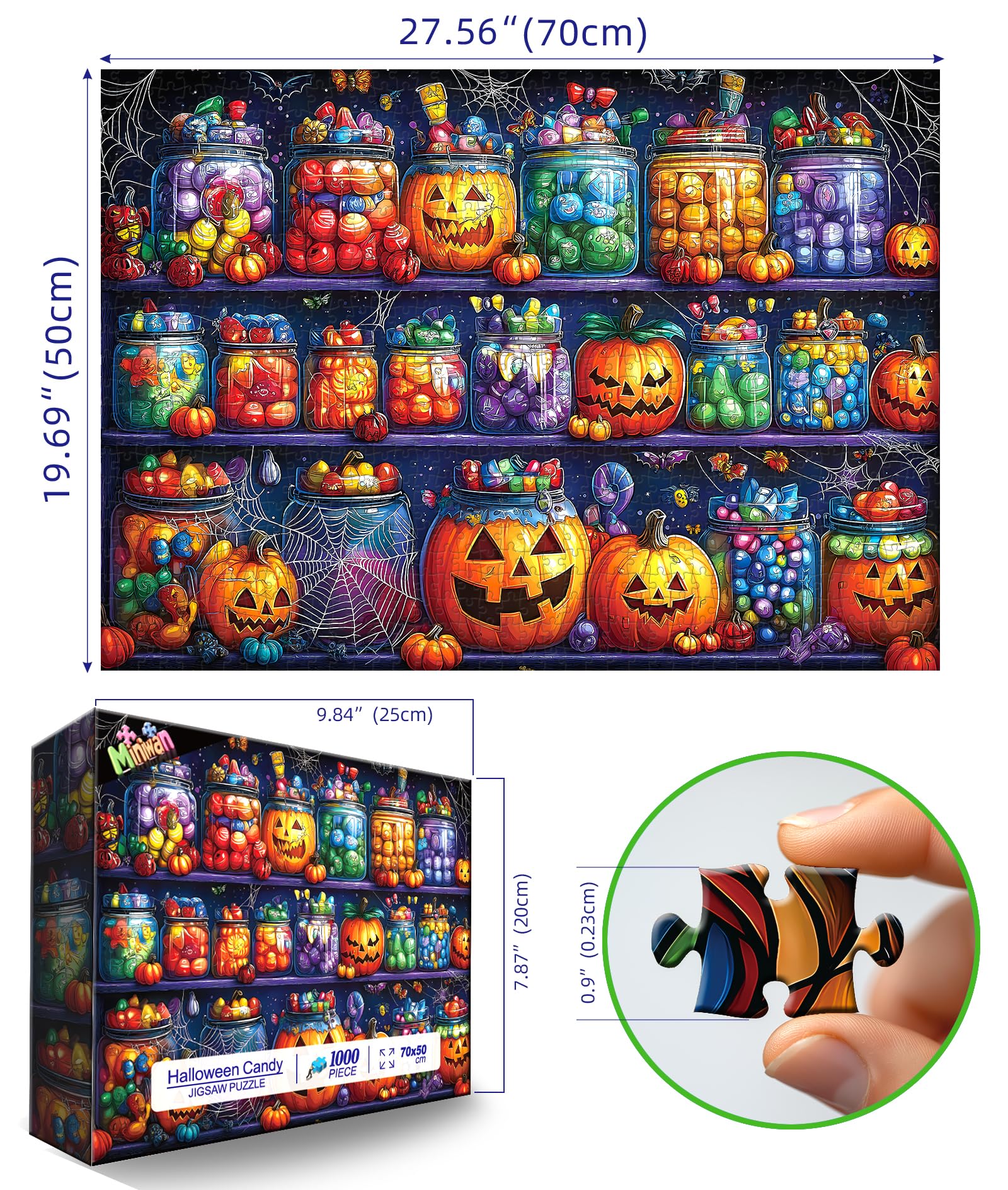 • 🎃 Spooky Halloween Delight: Immerse yourself in this 1000 piece puzzle for adults, featuring candy-filled mason jars and grinning jack-o'-lanterns. A perfect jigsaw puzzle for Halloween lovers, with vibrant colors and intricate details for a festive challenge.